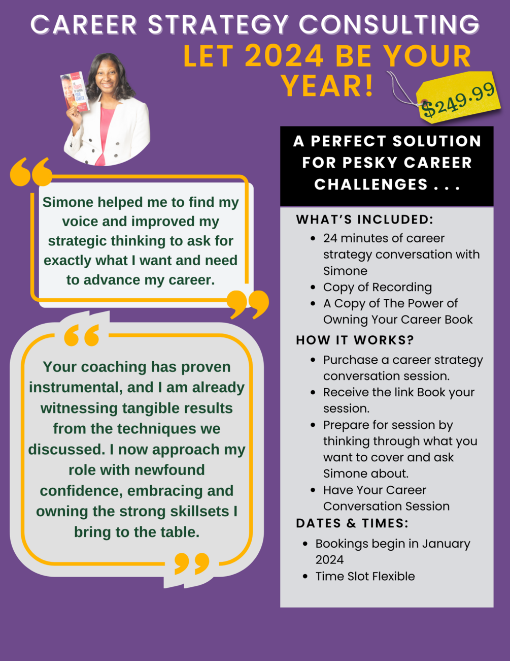 Are you struggling with career challenges? Let 2024 be your year! Start 2024 with 24 minutes of career consulting with Simone. This includes: